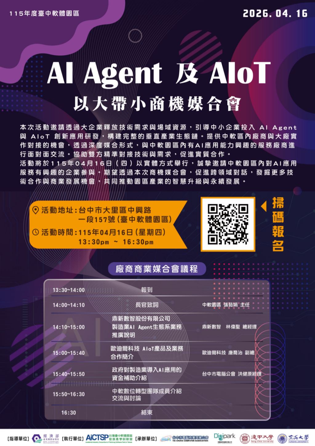 在產業加速邁向智慧化的趨勢下,為協助中軟園區企業拓展合作機會,我們於115年04月16日(週四)舉辦實體商機媒合活動,促進企業間的交流與對接。